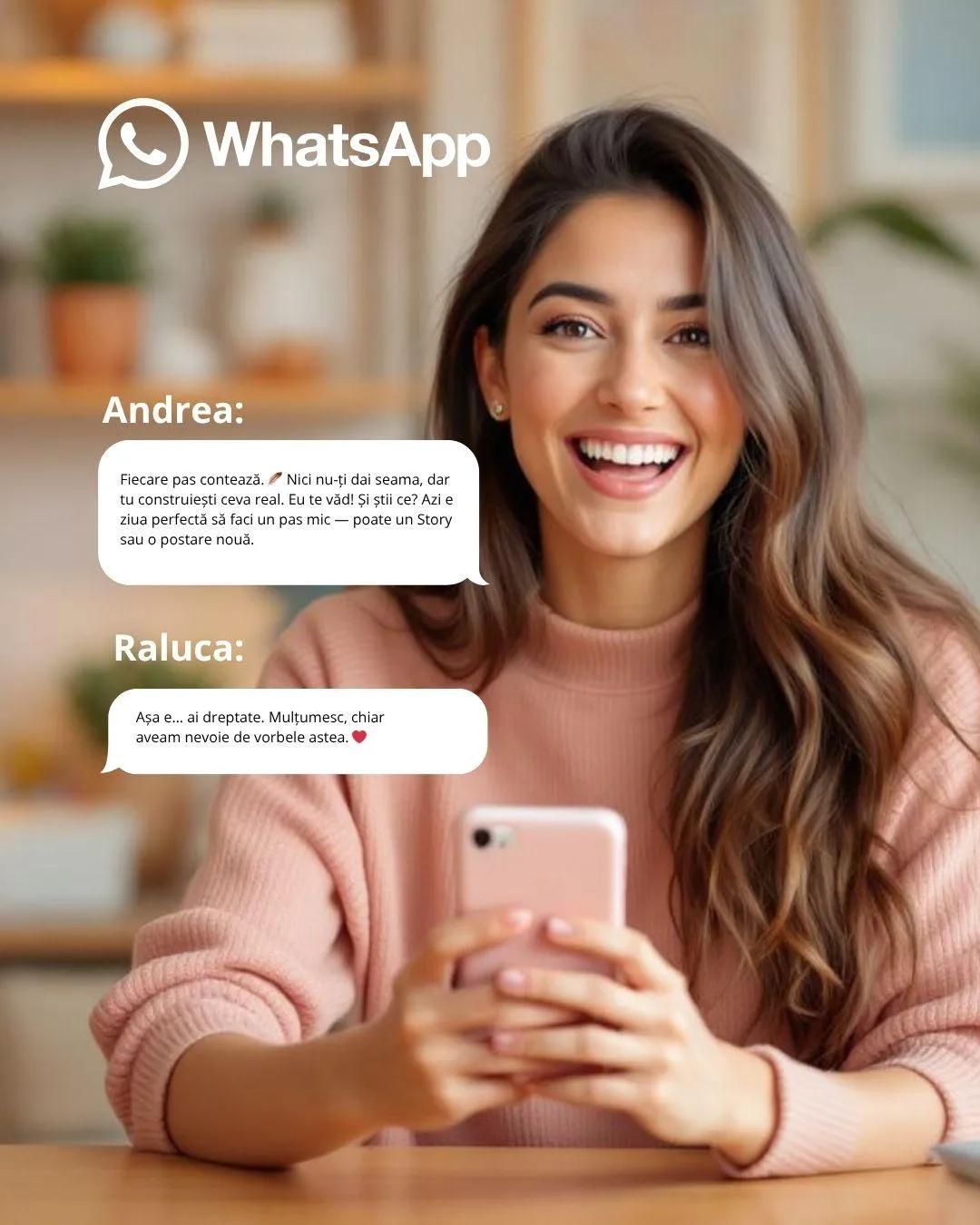 ✅ Rutină săptămânală: Luni – plan de postări & obiectivul tău Miercuri – Q&A scurt (mesaj vocal, tips rapide) Vineri – progres & micro-victorii (ce a mers, ce repetăm)